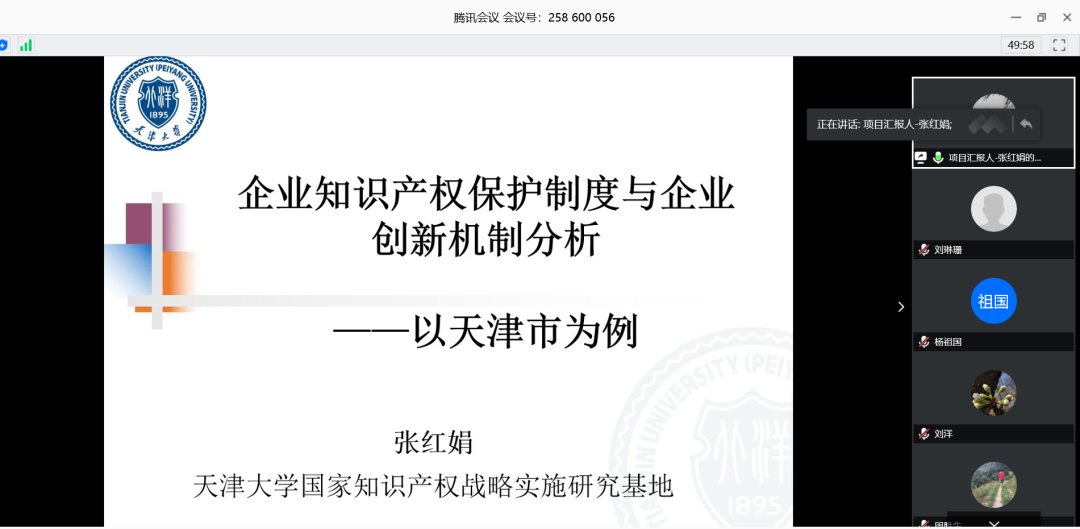 项目负责人张红娟老师就其承担的专项课题“企业知识产权保护制度与企业创新机制分析——以天津市为例”进行了开题汇报。张老师首先介绍了课题研究背景,指出知识产权保护与企业创新相互作用、协同演进,之后从天津市知识产权保护政策梳理构建知识产权保护度量指标体系、天津市知识产权保护制度演进过程阶段划分与特征分析、天津市知识产权保护制度与企业创新的相互影响与演进分析等方面梳理了课题研究内容,明确研究目标是为政府知识产权相关部门政策制定及企业创新战略制定提供对策建议,最后汇报了已经开展的工作和阶段性成果、及后续研究计划和进度安排。参会人员听取汇报后,表示本课题逻辑清楚、思路清晰,对相关部门的现实工作具有指导意义,建议课题组:明确数据采集的时间跨度,研究对象不只限于上市企业、应丰富企业类型,针对一些具体点位(如提高企业专利审查质量和效率等)深入研究、避免政策建议空泛化,研究方法补充定性调研和访谈、从而基于一手调查数据解决企业现实需求。