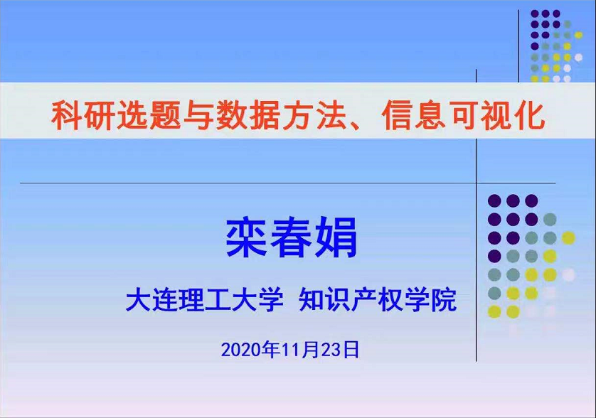 11月23日晚7:00,大连理工大学知识产权学院副院长栾春娟教授做客天津大学国家知识产权战略实施研究基地,带来了题为“科研选题与数据方法、信息可视化”的学术报告。本次讲座以腾讯会议的形式举行,吸引到了研究基地及校内外140余名师生前来聆听,讲座由天津大学国家知识产权战略实施研究基地常务副主任张俊艳主持。