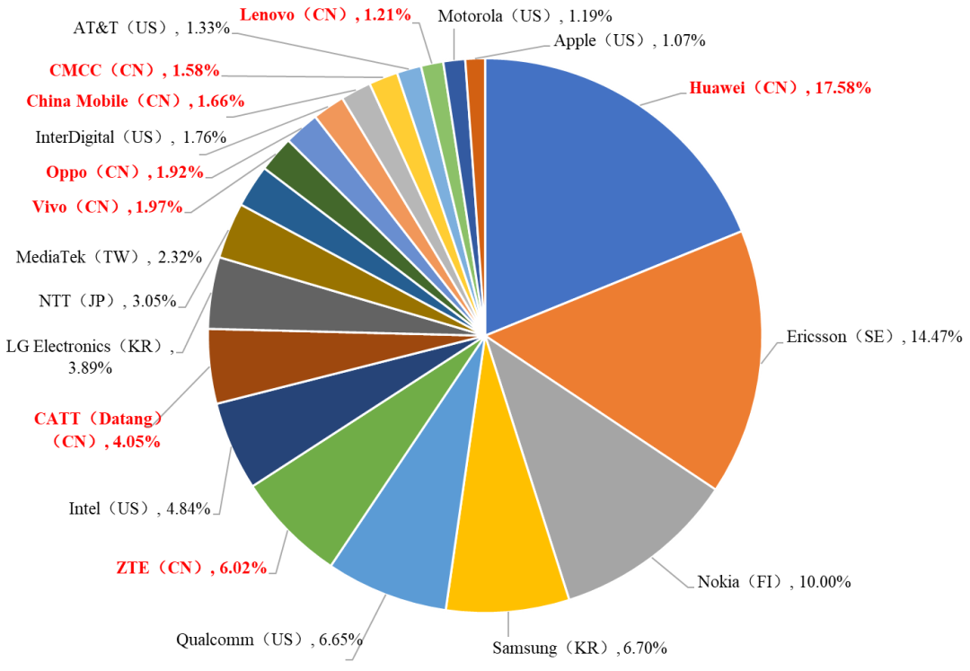 图3和图4分别为提交5G技术贡献和被采纳5G技术贡献份额排名前20的企业。其中,共有8家中国企业(图中红色标注),提交总数占全部的35.99%,被采纳总数占全部的39.29%,华为(Huawei)更是以17.58%(提交)和22.94%(采纳)的份额分列两个榜单第一。表明中国企业在5G标准的制定过程中参与度最高、贡献度最大,也进一步体现出我国在5G领域技术实力的不断增强。