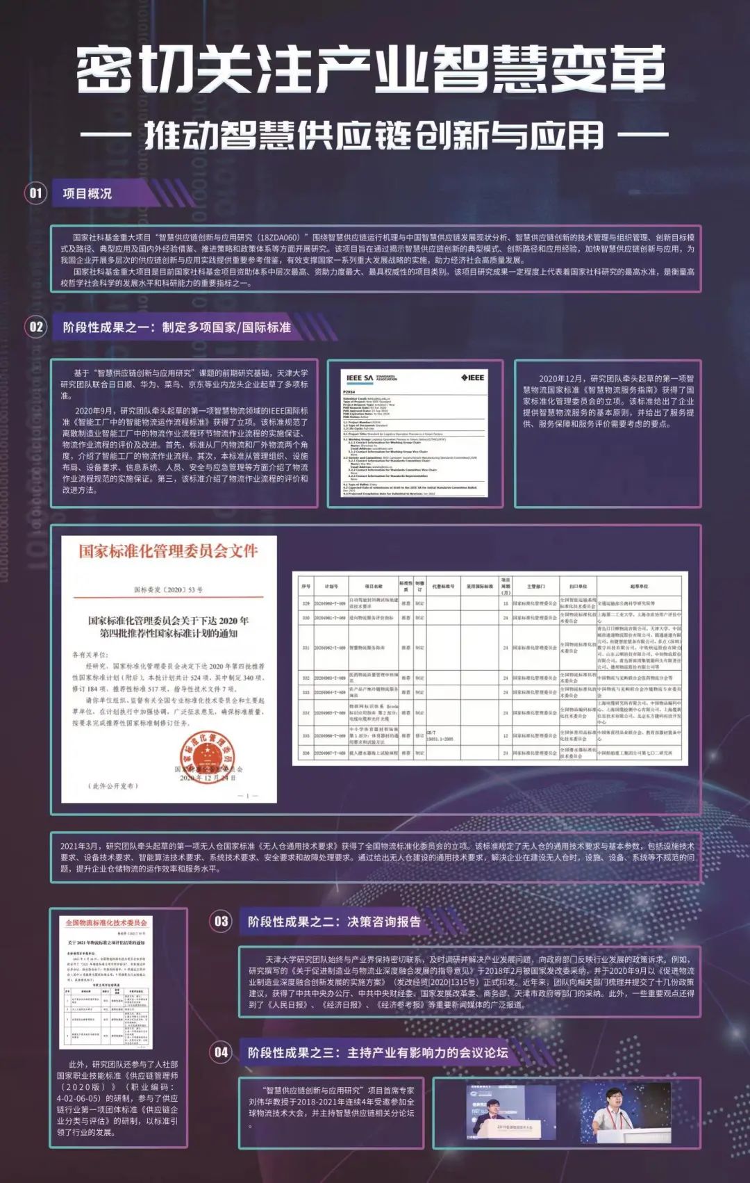 基于“智慧供应链创新与应用研究”课题的前期研究基础,天津大学研究团队联合日日顺、华为、菜鸟、京东等业内龙头企业起草了多项标准。