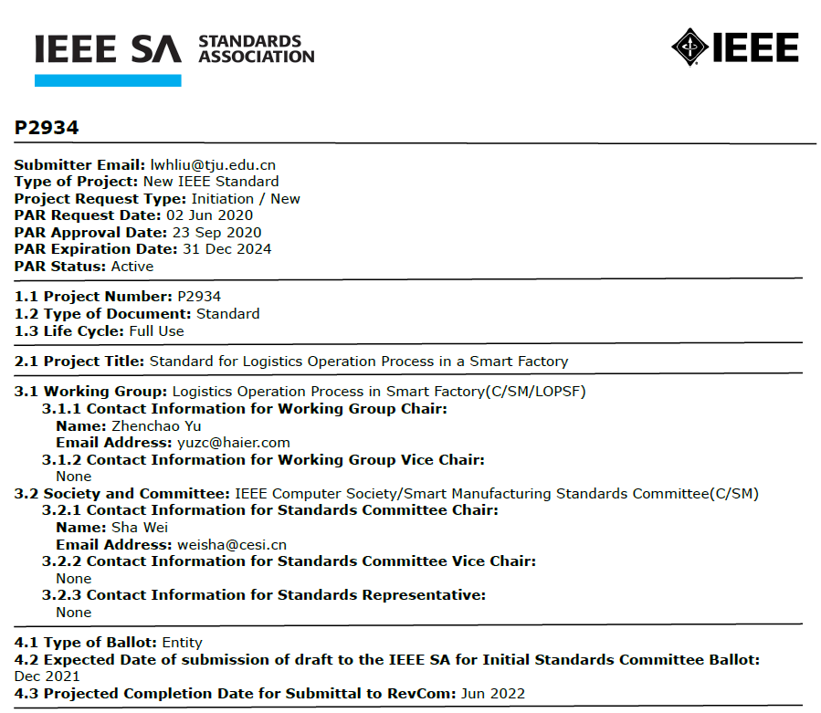 2020年9月,研究团队牵头起草的第一项智慧物流领域的IEEE国际标准《智能工厂中的智能物流运作流程标准》获得了立项。该标准规范了离散制造业智能工厂中的物流作业流程环节、物流作业流程的实施保证、物流作业流程的评价及改进。首先,标准从厂内物流和厂外物流两个角度,介绍了智能工厂的物流作业流程。其次,本标准从管理组织、设施布局、设备要求、信息系统、人员、安全与应急管理等方面介绍了物流作业流程规范的实施保证。第三,该标准介绍了物流作业流程的评价和改进方法。
