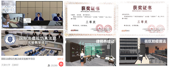 “国际法虚拟仿真法庭实验教学项目”解决了传统教学中的模拟法庭师资缺乏和实地学习成本高昂的问题,结合虚拟仿真和三维动画技术还原了国际刑事法院的法庭内部场景,制作了虚拟法官与学生进行交互式问答,并开创性地通过自然语言处理和语音识别技术对学生提交的法律文书和口头陈述内容进行自动评分。学生可以足不出户便能身临其境地感受国际裁判机构的魅力。双语版本有利于国际交流和共享。该项目至今在国家虚拟仿真实验教学课程共享平台上的浏览量为25290次,做实验人数达1217人。进一步将学生的法律学习和虚拟现实技术进行结合,其中学生的“街区防疫普法虚拟仿真软件”和“律师养成记虚拟仿真软件”获得了2020年曼杯全国VR设计制作大赛三等奖。