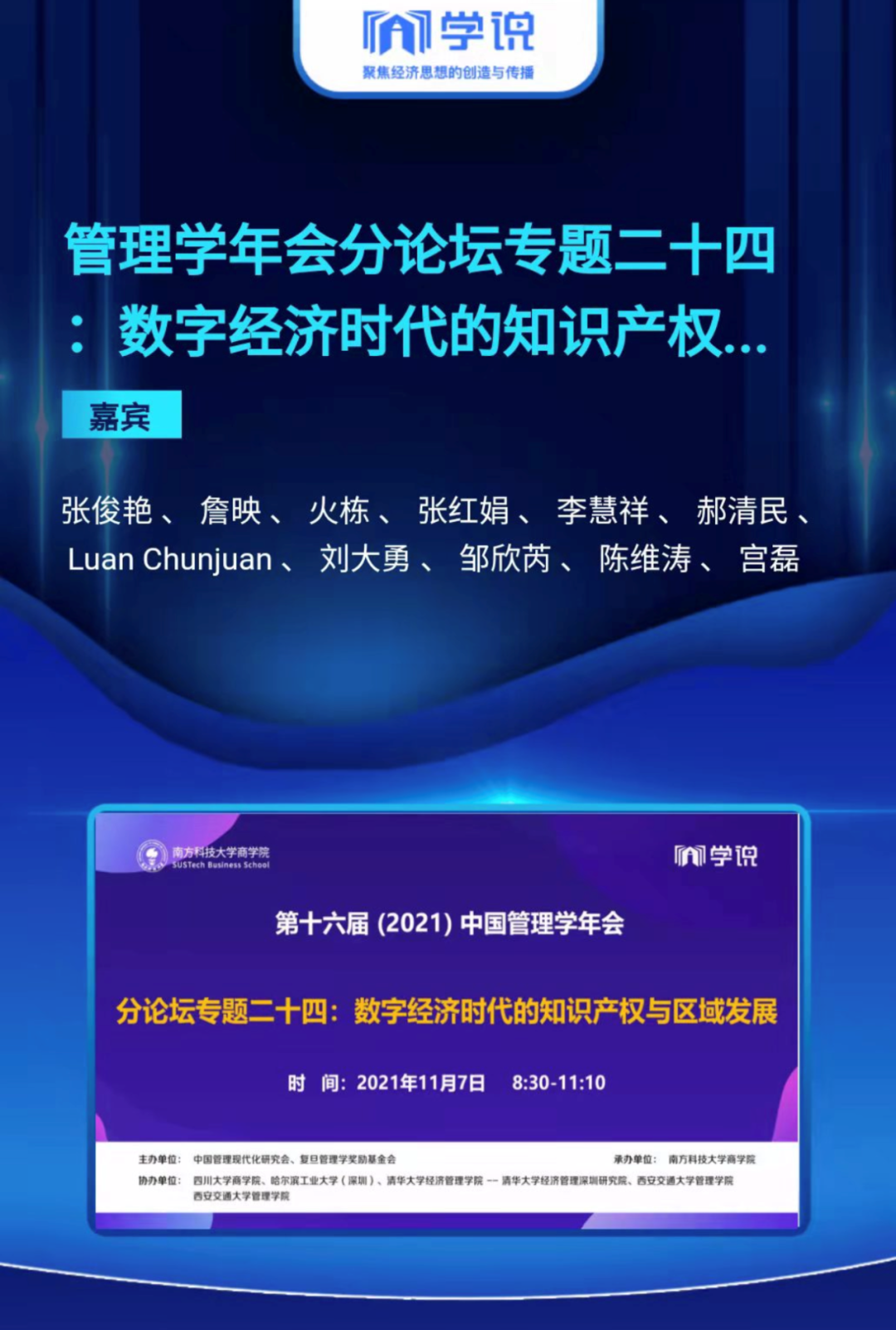 2021年11月7日上午,由中国管理现代化研究会、复旦管理学奖励基金会主办,南方科技大学商学院承办的第十六届(2021)中国管理学年会——知识产权管理专题分论坛在腾讯会议平台、学说直播平台线上成功举办。本次论坛分为“数字经济时代的知识产权与区域发展”和“数字经济时代的知识产权与管理创新”两个主题分会场,由中国管理现代化研究会知识产权管理专业委员会、中国知识产权研究会高校知识产权专业委员会知识产权管理和大数据中心、国家知识产权战略实施(天津大学)研究基地、天津大学科技创新智库具体协办,吸引到了700余位校内外师生前来参加本次论坛。