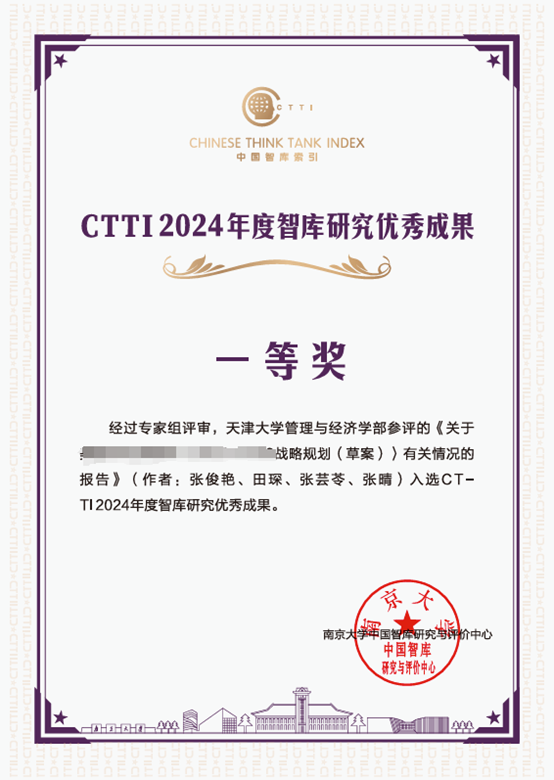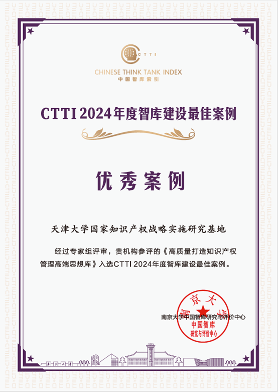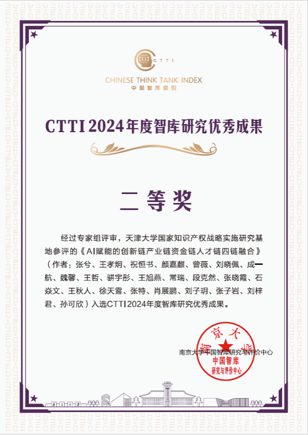 其中,天津大学国家知识产权战略实施研究基地表现不俗,张俊艳教授团队申报的关于战略规划的报告入选CTTI 2024年度智库研究优秀成果一等奖,张兮教授团队申报的《AI赋能的创新链产业链资金链人才链四链融合》入选CTTI 2024年度智库研究优秀成果二等奖,研究基地办公室申报的《高质量打造知识产权管理高端思想库》入选CTTI 2024年度智库建设最佳案例。